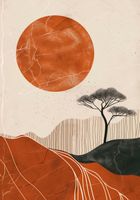 Plakat z serii boho zatytułowany Afrykański Zachód Słońca przedstawia malowniczą scenę z ciepłymi, ziemistymi barwami symbolizującymi niekończącą się pustynię. Wielkie, płonące słońce w kolorze rdzy wisi nad delikatnie zarysowanymi drzewami akacji, które są ikoniczne dla afrykańskiego krajobrazu. Linie konturów wzgórz i pustynnych wydm dodają głębi i perspektywy, a rysunkowe pęknięcia i plamy na słońcu nadają teksturę. Ta kompozycja łączy surowość pustyni z zachwycającym pięknem dzikiej przyrody, idealna dla wnętrz, które pragną odrobiny egzotyki i ciepła afrykańskich barw.