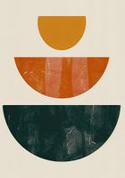 Plakat z serii boho zatytułowany Cykl Natury. Plakat przedstawia trzy przecinające się półkola, ułożone w pionowym szeregu, z których każde posiada unikalną fakturę i paletę barw - od spokojnego, złotego odcienia u góry, przez głęboką pomarańcz z akcentami ciepłej czerwieni pośrodku, do ciemnej, tajemniczej zieleni u dołu. Ta kompozycja wywołuje wrażenie harmonijnego przepływu czasu lub cykli natury. Świetnie sprawdzi się jako dekoracja w nowoczesnych przestrzeniach, takich jak minimalistyczne biura, salony w stylu skandynawskim, a także jako wyrafinowany akcent w strefach wypoczynkowych kawiarni lub butikowych hoteli.
