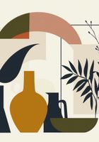 Plakat z serii minimalistyczne zatytułowany Formy Stylu. Grafika ta przedstawia abstrakcyjne kompozycje różnych form geometrycznych i roślin. Centralne miejsce zajmują stylizowane wazony i doniczki w ciepłych odcieniach brązu, żółci i czerni, które są przeplatają się z roślinami w odcieniach zielonym i czarnym. Tło składa się z nieregularnych bloków kolorów w stonowanych odcieniach beżu, pomarańczy i szarości, tworzących spokojny i uporządkowany układ.Ten plakat będzie doskonale komponować się we wnętrzach utrzymanych w nowoczesnym, minimalistycznym stylu, gdzie dominują czyste linie i neutralna paleta kolorów.