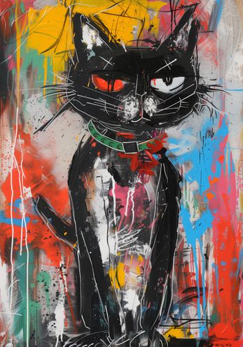 Plakat z serii abstrakcja zatytułowany Gburowaty Kiciak to odważne, street artowe przedstawienie czarnego kota z intensywnymi, czerwonymi oczami. Postać kota, zarysowana grubymi, dynamicznymi liniami, wyróżnia się na tle żywego, kolorowego graffiti. Dzieło łączy w sobie surowość miejskiego stylu z komicznym przedstawieniem zwierzęcia, co nadaje mu niepowtarzalny charakter. Drobne białe akcenty na sierści kota oraz wyraziste spojrzenie tworzą efekt, który przyciąga i utrzymuje wzrok obserwatora. Ten plakat, pełen energii i miejskiego ducha, doskonale odzwierciedla współczesną kulturową estetykę i będzie stanowił wyrazisty element dekoracyjny w nowoczesnych przestrzeniach takich jak loftowe apartamenty, kawiarnie i przestrzenie kreatywne.