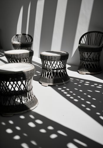 Plakat z serii wnętrza zatytułowany Gra Świateł to stylowa, monochromatyczna fotografia, która oddaje estetykę współczesnego designu. Na fotografii widzimy zestaw eleganckich, plecionych stołków z rattanu ustawionych na tle geometrycznych cieni. Ostre linie cieni przełamują okrągłe kształty mebli, tworząc fascynującą kompozycję pełną kontrastów. Białe siedziska stołków pięknie kontrastują z ciemniejszymi elementami, a gra światła i cienia nadaje scenie trójwymiarowość i teksturę. Plakat ten będzie doskonały dla miłośników minimalistycznych wnętrz, a także dla osób poszukujących elementu dekoracyjnego, który wprowadzi do pomieszczenia nowoczesny i artystyczny akcent. Idealny do nowoczesnych przestrzeni mieszkalnych, biur, kawiarni lub galerii sztuki.