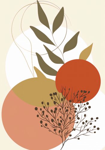 Plakat z serii minimalistyczne zatytułowany Impresja Jesieni.Grafika ta jest dynamiczna i wyważona, z pogłębioną paletą kolorów nawiązującą do jesiennego sezonu. Użyte odcienie czerwieni, pomarańczy i beżu, wsparte głęboką zielenią, wprowadzają uczucie ciepła i spokoju. Delikatne linie i formy przypominają o płynącym czasie i zmienności natury. Plakat ten mógłby być doskonałym akcentem w pomieszczeniach o neutralnym wystroju, wprowadzając element sezonowej zmiany i podkreślając naturalną elegancję przestrzeni.