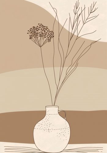 Plakat z serii minimalistyczne zatytułowany Kojący Wazon.Grafika z wprawą łączy subtelność natury z estetyką prostoty, przedstawiając bukiet suszonych roślin delikatnie umieszczonych w starannie wykonanym dzbanie. Dzieło gra na kontraście pomiędzy linearnym konturem a organicznymi kształtami, tworząc przy tym wizję pełną ciepła i spokoju. Tło w odcieniach beżu i brązu zapewnia kojący, zrównoważony nastrój, a całość kompozycji jest odzwierciedleniem natury uchwyconej w jej najprostszej formie. Plakat idealnie wpasuje się w wnętrza, gdzie dominuje spokój i naturalność, takie jak skandynawskie mieszkania, jasne gabinety czy przytulne zakątki do czytania. Jest to doskonały wybór dla tych, którzy pragną wprowadzić element natury do swojej przestrzeni bez jej dominacji, zachowując przy tym łagodny, neutralny ton.