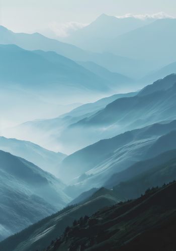 Plakat z serii pejzaże zatytułowany Między Chmurami, prezentuje zjawiskowy krajobraz górski. Warstwy delikatnie oświetlonych wzgórz i dolin tworzą głębię i atmosferę spokoju. Mgliste pasma nadają scenie eterycznego charakteru, a subtelna gra światła i cienia wzmacnia uczucie majestatycznej tajemnicy. Delikatna paleta błękitów i bieli podkreśla chłodną i spokojną atmosferę. Plakat idealnie nadaje się do pomieszczeń przeznaczonych do relaksu i medytacji, takich jak salony spa, pokoje do jogi, lub jako element wyciszający w domowych przestrzeniach mieszkalnych.
