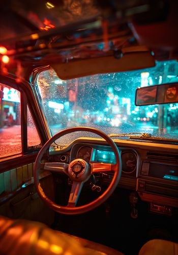 Plakat z serii pop art zatytułowany Nocny Kierowca, przedstawia widok z wnętrza klasycznego samochodu, patrząc przez deszczową, skraplaną szybę na rozświetlone neony miejskiego pejzażu nocą. Ciepłe, czerwone oświetlenie wnętrza samochodu kontrastuje z hipnotyzującym błękitem i elektrycznymi odcieniami świateł zewnętrznych, tworząc intymną, a jednocześnie dynamiczną atmosferę. Kropelki deszczu na szybie dodają tekstury i głębi, sprawiając, że scena jest zarówno realistyczna, jak i liryczna. To dzieło sztuki mogłoby znaleźć swoje miejsce w przestrzeniach nowoczesnych, miejskich loftów lub jako akcent w barze o tematyce retro, wprowadzając element tajemniczości i miejskiego romansu.