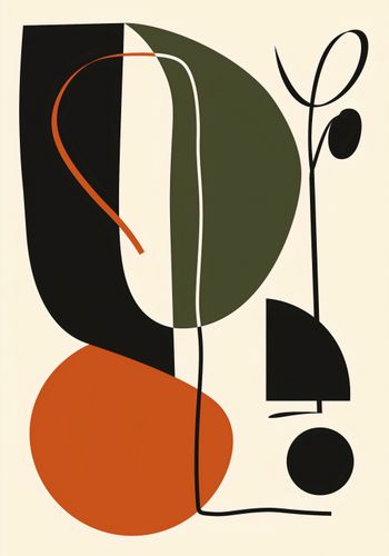 Plakat z serii minimalistyczne zatytułowany Symfonia Graweru. Plakat charakteryzuje się odważnym połączeniem abstrakcyjnych form i linii, które razem tworzą złożoną i intrygującą kompozycję. W palecie barw znajdują się głęboka czerń, spokojna oliwka, energiczna pomarańcza i stonowane beże, które nadają dziełu wyrafinowany, ale dynamiczny charakter. Kontrastowe kształty i płynne linie sugerują ruch i harmonię, mogące reprezentować muzykalność lub wewnętrzne połączenia. Ten plakat idealnie wpasuje się w nowoczesne, minimalistyczne wnętrza, które doceniają sztukę abstrakcyjną jako sposób wyrażania emocji i twórczej energii. Idealny do salonów, przestrzeni kreatywnych lub biurowych, wprowadzając do nich element unikatowego designu.