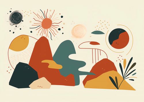 Plakat z serii minimalistyczne zatytułowany Kosmos Barw. To dynamiczne dzieło artystyczne łączy w sobie abstrakcyjne interpretacje kosmicznych ciał, jak planety i gwiazdy, z ziemskimi elementami krajobrazu. Zastosowana paleta barw to ciepłe odcienie czerwieni, pomarańczu i brązu kontrastujące z chłodnymi tonami szarości i błękitu, co nadaje kompozycji głębię i wizualne napięcie. Plakat ten idealnie wpasuje się w nowoczesne wnętrza poszukujące odrobiny abstrakcji i niebanalnych rozwiązań w dekoracji. Może być inspirującym akcentem w salonie, przestrzeni kreatywnej, a nawet w miejscach publicznych, takich jak galerie sztuki lub nowoczesne przestrzenie biurowe, przynosząc z sobą element refleksji i nowoczesności.
