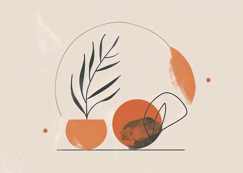 Plakat z serii boho zatytułowany Tonacja Pasteli. Plakat przedstawia harmonijną kompozycję elementów natury i abstrakcyjnych kształtów. Widzimy doniczkę z delikatną rośliną o czarnych, smukłych liściach, które delikatnie kontrastują z ciepłym odcieniem pomarańczy naczynia. Towarzyszą jej geometryczne formy: dwa krągłe kształty w tonacji ziemi, które przeplatają się, tworząc iluzję przestrzeni i głębi. Rysunek uzupełnia subtelna linia horyzontu i rozproszone kropki, dodające plakatowi dynamiki. Idealnie sprawdzi się jako element dekoracyjny w pomieszczeniach, gdzie dominuje spokój i równowaga, takich jak jasne, przestronne salony, pokoje do medytacji lub ciche zakątki bibliotek.