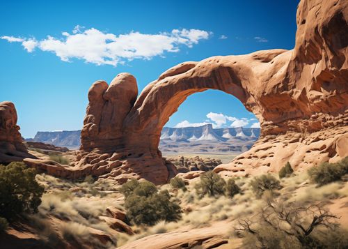 Plakat z serii pejzaże zatytułowany Triumf Natury. Zapierający dech w piersiach widok naturalnej formacji skalnej, która tworzy naturalny łuk, jest świadectwem niezwykłej siły i wytrwałości natury. Ciepłe odcienie pomarańczu i brązu skalnego łuku kontrastują z głębokim błękitem nieba, a delikatne zielone akcenty roślinności dodają życia i głębi kompozycji. Ta scena emanuje siłą i spokojem, stanowiąc doskonałe uzupełnienie dla przestrzeni takich jak współczesne biura, eleganckie pokoje dziennego wypoczynku, a także jako element dekoracyjny w hotelach i miejscach publicznych, gdzie natura spotyka się z designem.