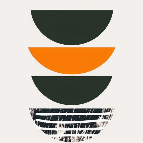 Plakat z serii boho zatytułowany Gra Tekstur to połączenie czystych, geometrycznych form z wyrazistą grą tekstur. Trzy półkoliste kształty w odcieniach głębokiej zieleni i żywej pomarańczy są ułożone w precyzyjny stos, tworząc zaskakującą głębię i zmysłową symetrię. Najniższa forma przerywa ten porządek, wprowadzając do dzieła dynamiczne, surowe detale, przypominające efekt artystycznego, spontanicznego malowania lub drapowania. Ten plakat jest idealnym wyborem dla wnętrz, które doceniają silne, graficzne elementy oraz surowy, industrialny klimat, pasując zarówno do minimalistycznych, jak i bardziej eklektycznych przestrzeni.