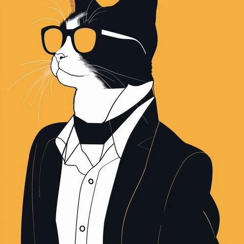 Plakat z serii abstrakcja zatytułowany Jegomość to stylizowany portret kota w ludzkim ubiorze. Charakterystyczne, czarno-białe ubarwienie kota zostało podkreślone przez elegancki, czarny garnitur z białą koszulą oraz modnymi, żółtymi okularami, które dodają postaci wyrafinowanego uroku. Tło w intensywnym odcieniu musztardy idealnie komponuje się z całością, nadając plakatowi ciepły i wyrazisty charakter. Silny profil kota, wyraźne linie i minimalistyczne podejście do szczegółów czynią ten plakat zarówno zabawnym, jak i eleganckim, idealnym do przestrzeni, które cenią sobie humor i styl, takich jak nowoczesne biura, domowe biblioteki czy saloniki.