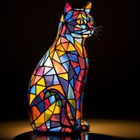 Plakat z serii abstrakcja zatytułowany Koci Witraż. Ten plakat przedstawia artystyczną ilustrację kota, który jest stylizowany na witraż. Zwierzę jest zbudowane z wielu kolorowych, geometrycznych kształtów, które przypominają szklane fragmenty witraża. Barwy są żywe i różnorodne, z przewagą odcieni niebieskiego, czerwonego, żółtego i pomarańczowego, tworząc wizualną ucztę, która zarówno przykuwa uwagę, jak i przyjemnie dla oka. Kot jest przedstawiony w profilu, siedząc z eleganckim, dostojnym położeniem, co dodaje ilustracji majestatycznego charakteru. Tło jest proste i ciemne, co pozwala na to, aby kolory kota były jeszcze bardziej wyraziste. Ta praca może być interpretowana jako hołd dla klasycznej formy sztuki, jaką jest witraż, połączony z nowoczesną grafiką cyfrową, tworząc unikalne i współczesne dzieło sztuki.