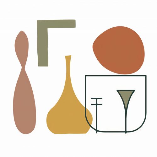 Plakat z serii boho zatytułowany Naczynia. Plakat prezentuje kolekcję abstrakcyjnych form, które przypominają różne przedmioty od naczyń po elementy dekoracyjne, tworząc estetyczną mieszankę linii i kształtów. Zestawienie spokojnych, pastelowych barw z silnymi, geometrycznymi figurami tworzy wizualnie przyjemną kompozycję, która zwraca uwagę swoją subtelną elegancją. To dzieło artystyczne jest doskonałym wyborem dla wnętrz o nowoczesnym designie, w których chcemy wprowadzić sztukę bez dominujących nad przestrzenią. Idealnie sprawdzi się jako delikatny akcent w przestronnym salonie, biurze czy jako część galerii w domowym korytarzu.