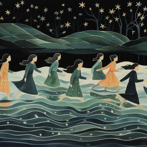 Plakat z serii wnętrza zatytułowany Nocna Procesja, przedstawia sylwetki kobiet, idących w rytmicznym ruchu przez wody, pod tajemniczym, gwiaździstym niebem. Styl plakatu, z płynnymi liniami i miękkimi pastelowymi kolorami, tworzy uczucie spokoju i onirycznej atmosfery. Postacie są przedstawione w ruchu, z włosami rozwianymi przez nocny wiatr, co dodaje dziełu poczucia tajemnicy i ruchu. Ten plakat idealnie nadaje się do wnętrz, które chcą wyrazić poczucie spokoju, introspekcji oraz kobiecej siły i solidarności, takich jak prywatne biblioteki, pokoje medytacyjne, a także przestrzenie publiczne, które pragną inspirować swoich gości do głębszego zastanowienia się nad otaczającym ich światem.