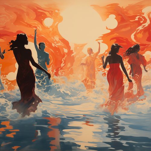 Plakat z serii wnętrza zatytułowany Taneczny Żar, przedstawia grupę osób tańczących w rytmicznych ruchach w wodzie, z tłem zapalającego się nieba w odcieniach ciepłego pomarańczu i czerwieni. Postacie są przedstawione w dynamicznych pozach, z włosami rozwianymi przez wiatr, co nadaje obrazowi wrażenie ruchu i pasji. Styl plakatu, z jego płynnymi liniami i żywymi kolorami, tworzy uczucie energii i życia. Ten plakat idealnie nadaje się do wnętrz, które chcą uchwycić esencję ruchu, radości i wolności, takich jak studia taneczne, kreatywne przestrzenie pracy, a także jako inspirujący element w domach, gdzie może stanowić przypomnienie o pięknie wspólnych chwil i celebracji życia.