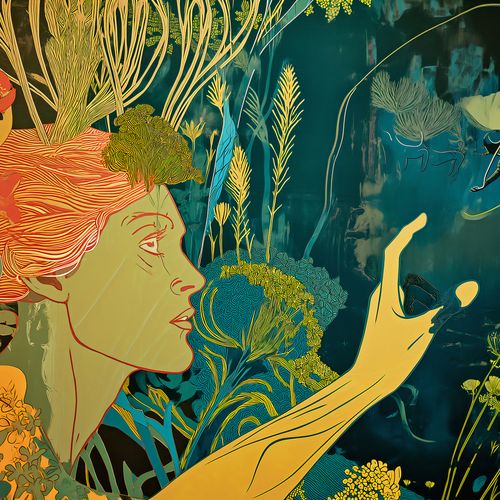 Plakat z serii abstrakcja zatytułowany Wezwanie do Flory, ukazuje poetycką synergię między ludzką postacią a naturą. Zanurzona w bogatym, zielonym otoczeniu, kobieta wydaje się być jednością z leśną fauną i florą, które są stylizowane w surrealistyczny sposób. Jej czerwone włosy przechodzą w płatki kwiatów, a kontury jej twarzy delikatnie współgrają z organicznymi kształtami roślin. Plakat ten, z jego żywymi kolorami i złożoną kompozycją, idealnie nadaje się do przestrzeni, która celebruje naturę i sztukę, takich jak galerie, nowoczesne mieszkania, lub przestrzenie publiczne o tematyce ekologicznej. Ta praca przyciąga wzrok i inspiruje do refleksji nad bliskimi związkami człowieka z przyrodą.