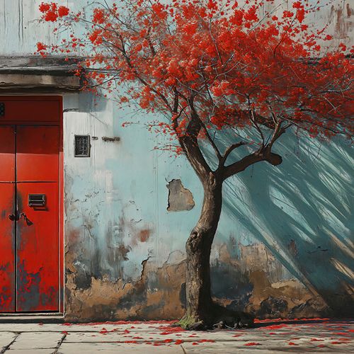 Plakat z serii wnętrza zatytułowany Widok Na Dawne. Kompozycja łączy surowość starych, połatanych ścian w stonowanych kolorach z wyrazistym czerwonym drzwiami oraz rozkwitłym drzewem o żywym karmazynowym kolorze, które zdaje się wprowadzać życie i energię do miejskiej monotonii. Promienie światła przenikające przez liście dodają głębi i tajemniczości scenie. Ten plakat doskonale wkomponuje się w przestrzenie kreatywne, galerie sztuki lub jako akcent w minimalistycznych, nowoczesnych wnętrzach, przynosząc z sobą odrobinę miejskiego romansu i poezji codzienności.