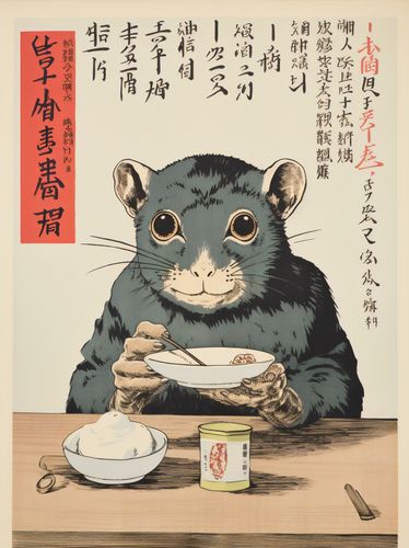 Plakat z serii motywy wschodnie zatytułowany Chwila Refleksji. Intrygujące spojrzenie gryzonia w tradycyjnym stroju, podkreślane przez błękitną tunikę i precyzyjne detale, które nadają mu humanoidalnego charakteru. Czerwone naczynia oraz kanji w tle kontrastują z jasnymi barwami obrazu, dodając nuty głębi i dziedzictwa kulturowego. Subtelna gra światła i cienia na stoliku z jedzeniem i napojem wzbogaca kompozycję i zachęca do refleksji nad połączeniem tradycji z nowoczesnością. Świetnie sprawdzi się w kawiarniach o azjatyckim klimacie, galeriach sztuki oraz w przestrzeniach dedykowanych kulturze Wschodu.