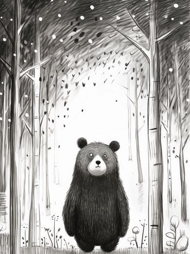 Plakat z serii wnętrza zatytułowany Ciekawski Miś. Ten uroczy plakat ilustracyjny przedstawia przyjaznego, czarno-białego misia stojącego na dwóch nogach w środku leśnej polany, patrzącego z ciekawością w górę na delikatnie opadające płatki śniegu. Stylizowany na rysunek piórkiem z miękkimi odcieniami szarości, wprowadza atmosferę spokoju i zaciekawienia naturą. Idealny do ozdoby pokoju dziecięcego, jako element dekoracyjny w przestrzeniach edukacyjnych lub jako ciepły akcent w domowych salonach.