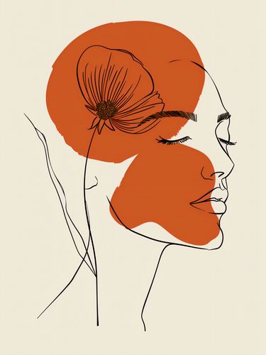 Plakat z serii minimalistyczne zatytułowany Ciepło Kwiatu to połączenie delikatności kobiecego profilu z silnym, graficznym motywem kwiatu. Ciepła, pomarańczowa plama w kształcie koła harmonizuje z konturem twarzy kobiety, a umieszczony na niej kwiat stanowi zarówno dekorację, jak i symboliczny akcent. Linie szkicu są subtelne, ale wyraziste, podkreślające spokojne, zamyślone wyrażenie twarzy. Plakat łączy w sobie prostotę z elegancją, idealnie pasując do przestrzeni, gdzie sztuka ma odzwierciedlać spokój i wewnętrzne piękno, takich jak sypialnie, salony, a nawet nowoczesne biura.