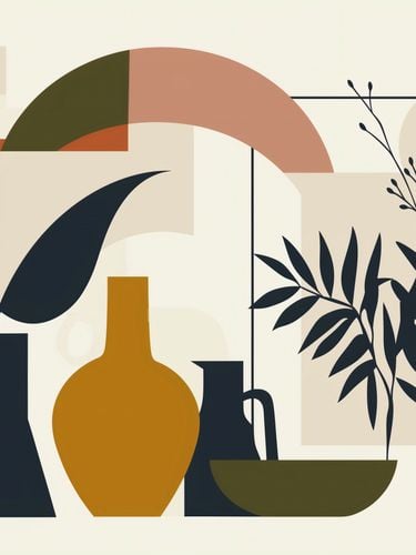 Plakat z serii minimalistyczne zatytułowany Formy Stylu. Grafika ta przedstawia abstrakcyjne kompozycje różnych form geometrycznych i roślin. Centralne miejsce zajmują stylizowane wazony i doniczki w ciepłych odcieniach brązu, żółci i czerni, które są przeplatają się z roślinami w odcieniach zielonym i czarnym. Tło składa się z nieregularnych bloków kolorów w stonowanych odcieniach beżu, pomarańczy i szarości, tworzących spokojny i uporządkowany układ.Ten plakat będzie doskonale komponować się we wnętrzach utrzymanych w nowoczesnym, minimalistycznym stylu, gdzie dominują czyste linie i neutralna paleta kolorów.