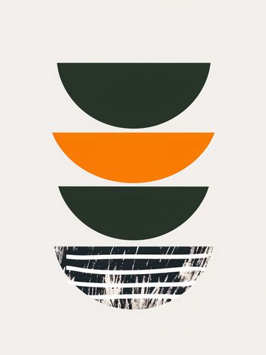 Plakat z serii boho zatytułowany Gra Tekstur to połączenie czystych, geometrycznych form z wyrazistą grą tekstur. Trzy półkoliste kształty w odcieniach głębokiej zieleni i żywej pomarańczy są ułożone w precyzyjny stos, tworząc zaskakującą głębię i zmysłową symetrię. Najniższa forma przerywa ten porządek, wprowadzając do dzieła dynamiczne, surowe detale, przypominające efekt artystycznego, spontanicznego malowania lub drapowania. Ten plakat jest idealnym wyborem dla wnętrz, które doceniają silne, graficzne elementy oraz surowy, industrialny klimat, pasując zarówno do minimalistycznych, jak i bardziej eklektycznych przestrzeni.