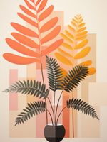 Plakat z serii wnętrza zatytułowany Harmonia Natury. Geometryczne kształty tła w delikatnych pastelowych odcieniach łączą się z organicznymi formami liści w energetycznych barwach czerwieni, żółci i zieleni. Ciemna, minimalistyczna waza stanowi mocny akcent, który spaja całość kompozycji. Ta unikalna kombinacja klasycznych i nowoczesnych elementów tworzy wizualną opowieść o równowadze i elegancji natury w urbanistycznym środowisku. Świetnie sprawdzi się w nowoczesnych biurach, w przestrzeniach artystycznych galerii czy w minimalistycznych loftach, gdzie design łączy się z naturą.