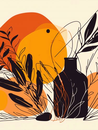 Plakat z serii minimalistyczne zatytułowany Jaskrawy Zachód. Na grafice widnieje silnie stylizowany motyw roślinny, gdzie czarne sylwetki roślin kontrastują z jaskrawo pomarańczowym i żółtym tłem, przypominającym zachodzące słońce. W tle pojawiają się delikatne, abstrakcyjne linie i kształty, dodające kompozycji głębi i tekstury.Ten plakat doskonale wpasuje się w wnętrza ożywione roślinnością, zarówno te domowe, jak i komercyjne przestrzenie typu kawiarnie lub sklepy z roślinami. Jego ciepłe barwy będą wprowadzać przytulną atmosferę i mogą stanowić żywy akcent w przestrzeniach utrzymanych w naturalnej kolorystyce.