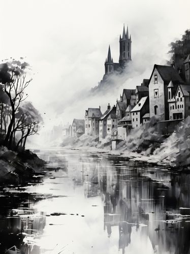 Plakat z serii pejzaże zatytułowany Mglisty Refleks. Misterne pociągnięcia pędzla przedstawiają starą wieś schowaną w mrocznych zakątkach gór, z dominującymi wieżami kościoła wznoszącymi się nad nią. Mgła otulająca krajobraz i odbicie w spokojnej wodzie tworzą atmosferę tajemniczości i zadumy. Monochromatyczna paleta barw dodaje głębi i intensywności całemu obrazowi, czyniąc go idealnym wyborem dla klasycznych salonów oraz miejsc takich jak kawiarnie o historycznym charakterze czy ekskluzywne kluby dyskusyjne.