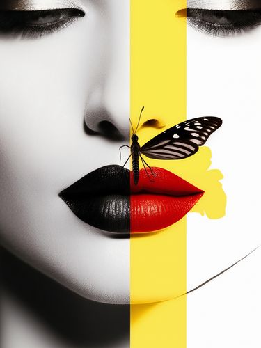 Plakat z serii abstrakcja zatytułowany Motyla Piękność. Ten plakat przedstawia twarz kobiety podzieloną na dwa kontrastujące segmenty: jeden w czerni i bieli, drugi w żywych kolorach z motylem na ustach. Ilustracja eksploruje temat dualizmu natury ludzkiej, piękna i jego zmienności. Plakat ten jest idealnym wyborem dla przestrzeni o współczesnym designie, takich jak salony piękności, studia artystyczne, a także jako wyrazisty element dekoracyjny w nowoczesnych domach.