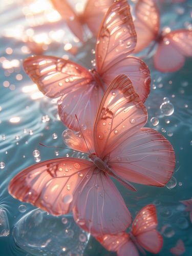 Plakat z serii natura zatytułowany Świetliste Motyle. Na plakacie widzimy delikatne motyle o przezroczystych, różowych skrzydłach, unoszące się nad wodą i łagodnie odbijające światło słoneczne. Kropelki wody na ich skrzydłach dodają uczucia świeżości i czystości. Plakat emanuje spokojem i pięknem, idealnie nadając się do przestrzeni, które chcą wprowadzić element relaksu i spokoju, takich jak spa, pokoje medytacyjne, a także jako łagodny element dekoracyjny do domu.