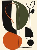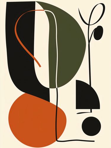 Plakat z serii minimalistyczne zatytułowany Symfonia Graweru. Plakat charakteryzuje się odważnym połączeniem abstrakcyjnych form i linii, które razem tworzą złożoną i intrygującą kompozycję. W palecie barw znajdują się głęboka czerń, spokojna oliwka, energiczna pomarańcza i stonowane beże, które nadają dziełu wyrafinowany, ale dynamiczny charakter. Kontrastowe kształty i płynne linie sugerują ruch i harmonię, mogące reprezentować muzykalność lub wewnętrzne połączenia. Ten plakat idealnie wpasuje się w nowoczesne, minimalistyczne wnętrza, które doceniają sztukę abstrakcyjną jako sposób wyrażania emocji i twórczej energii. Idealny do salonów, przestrzeni kreatywnych lub biurowych, wprowadzając do nich element unikatowego designu.