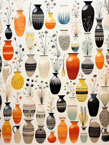 Plakat z serii wnętrza zatytułowany Symfonia Wazonów. Wspaniałe wazony w bogatej palecie kolorów, od głębokiej czerni do ciepłych odcieni pomarańczu, tworzą intrygującą mozaikę wzorów i kształtów. Delikatne motywy roślinne, które zdobią niektóre wazony, dodają uroku i lekkości, a różnorodność wzorów i faktur przyciąga wzrok i zaprasza do głębszej refleksji. Kontrast między jasnymi i ciemnymi barwami, a także subtelne niuanse w każdym wazonie, dodają tej kompozycji głębi i dramatu. Ten artystyczny plakat doskonale wpisuje się w klimat wyrafinowanych galerii sztuki, eleganckich kawiarni oraz nowoczesnych przestrzeni mieszkalnych, które stawiają na unikatowy design.