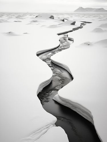 Plakat z kolekcji pejzaże zatytułowany Meandry Mrozu. Ten plakat przedstawia sinący lodowiec, którego szczeliny przecinają śnieżnobiałą powierzchnię, tworząc naturalne dzieło sztuki. Monochromatyczna paleta barw, gdzie biel śniegu kontrastuje z głębokim czerniami wód lodowcowych, przemawia do wyobraźni i wywołuje uczucie surowości oraz majestatu natury. Doskonały do wnętrz o minimalistycznym designie lub jako mocny wizualny akcent w przestrzeniach takich jak salony, biura i lobby hotelowe, gdzie może inspirować do refleksji nad pięknem i siłą przyrody.