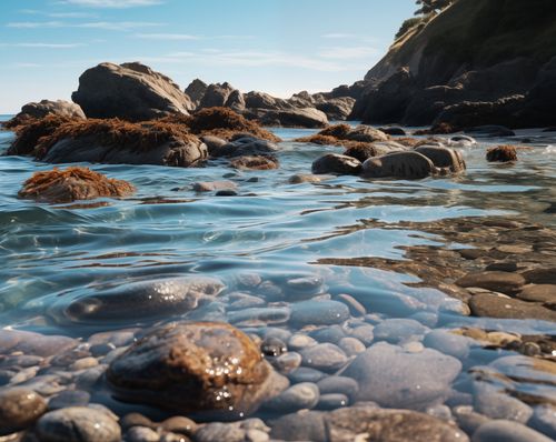 Plakat z serii pejzaże Harmonia Przybrzeżna przedstawia idylliczną scenę nadmorskiego krajobrazu, gdzie spokojne, krystalicznie czyste wody delikatnie odbijają skaliste wybrzeże. Skały pokryte morskimi wodorostami i okrągłe kamienie na pierwszym planie stanowią kontrast dla miękkiej tekstury wody. To artystyczne dzieło przypomina o naturalnej elegancji i spokoju, jakie można znaleźć w naturze. Plakat doskonale wpasuje się w przestrzenie pełne naturalnego światła i organicznych elementów, takie jak salon z widokiem na morze, gabinet relaksacyjny, czy przestrzeń wellness w luksusowym hotelu czy spa.