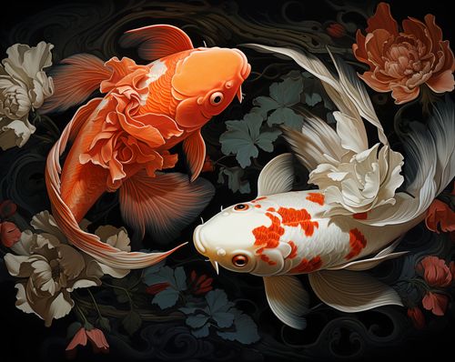 Plakat z serii motywy wschodnie zatytułowany Harmonijny Taniec to arcydzieło, które wyraża subtelność i równowagę przez harmonijne współistnienie natury i sztuki. Dwie ryby koi, jedna w odcieniach płomiennego pomarańczu, druga w pastelowych barwach kremu z akcentami czerwieni, są przedstawione w eleganckim tańcu, który jest tak płynny i gracji jak ruchy baletnicy. Ich delikatne płetwy przypominają falujące tkaniny, unoszące się w wodnym balecie, otoczone przez misternie malowane kwiaty, które dodają całości organicznej głębi. To zmysłowe i prowokujące do refleksji dzieło, które doskonale uzupełni każde wyrafinowane wnętrze, od stylowych kawiarni po intymne przestrzenie prywatne, gdzie design łączy się z naturalnym pięknem.