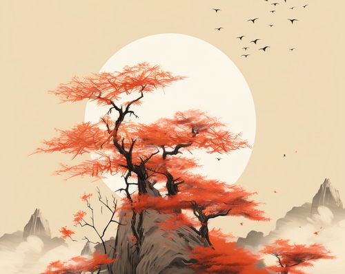 Plakat z serii pejzaże zatytułowany Szepty Wiatru. Niesamowity krajobraz z jaskrawo czerwonymi drzewami rosnącymi na majestatycznej skale, której kształty wydają się być ukształtowane przez wieki. Błyszczący biały księżyc oświetla spokojne wody, które otaczają skale, podczas gdy stado ptaków przenika przez jasne niebo, dodając uczucie przestrzeni i nieskończoności. Subtelne odcienie szarości i biele w tle tworzą kontrast dla wyrazistych czerwieni drzew, nadając scenie głębię i dramatyzm. Idealny do ozdoby salonów medytacyjnych, gabinetów terapeutycznych lub luksusowych hotelowych holów.