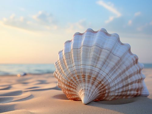 Plakat z serii natura zatytułowany Echo Morza. Delikatne, pastelowe barwy muszli występujące na pierwszym planie, z jej wyraźnymi liniami i subtelnym przejściem kolorów od kremowego do różowego, kontrastują z dynamicznym tłem zachodzącego słońca nad morzem. Złote refleksy światła na wodzie i miękki, piaskowy pierwszy plan tworzą poczucie głębi i spokoju. Idealny do wnętrz o tematyce morskiej, relaksacyjnych spa oraz jako element dekoracyjny w pokojach hotelowych z widokiem na morze.
