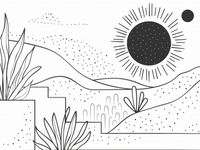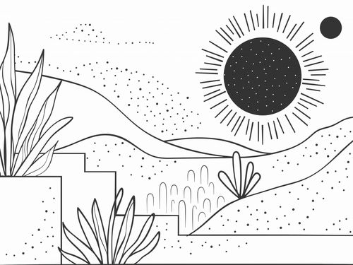 Plakat z serii minimalistyczne zatytułowany Linearny Pejzaż. Plakat przedstawia liniową ilustrację krajobrazu w czerni i bieli, gdzie przestrzeń zapełniają delikatne linie, kropki i abstrakcyjne formy roślinności. Centralnym punktem jest stylizowane słońce z promieniami rozchodzącymi się we wszystkie strony, towarzyszy mu mniejsze ciało niebieskie, które może symbolizować planetę lub księżyc. Lekkie kropki sugerują obecność piasku lub gwiazd, dodając elementu fantazji. Ten plakat wprowadzi do każdej przestrzeni element spokoju i prostoty. Idealnie nadaje się do nowoczesnych przestrzeni, takich jak minimalistyczne biura, jadalnie czy pokoje młodzieżowe, dostarczając neutralnej palety, która pasuje do wielu schematów kolorystycznych i stylów dekoracyjnych.