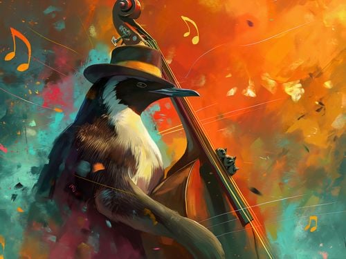 Plakat z serii abstrakcja zatytułowany Pingwinia Nuta. Przedstawia figurę pingwiniego muzyka, elegancko ubranego, grającego na kontrabasie. Ptak nosi klasyczny kapelusz, który dodaje mu artystycznego charakteru, a jego pióra delikatnie przechodzą w struny instrumentu, co tworzy efekt płynnego połączenia muzyki z naturą. Tło plakatu rozświetlone jest ciepłymi, żywymi barwami oraz abstrakcyjnymi kształtami, które przypominają rozsypane nuty i dynamiczny ruch jazzowej melodii. Ten plakat idealnie nada się do wnętrz o muzycznym duszu, takich jak sale koncertowe, studia nagraniowe, jazzowe kluby lub nawet domowe przestrzenie dla miłośników muzyki. Wizualizuje on pasję do muzyki i jej wpływ na otaczającą nas przestrzeń, jednocześnie wprowadzając element wyrafinowanego stylu.