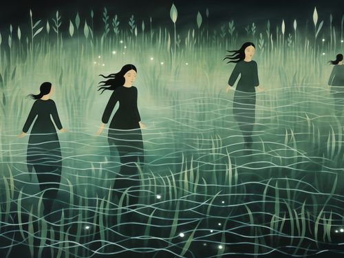 Plakat z serii wnętrza zatytułowany Pośród Ciszy, przedstawia grupę postaci kobiecych, poruszających się z gracją przez mglisty, oniryczny krajobraz. Zanurzone po kolana w wodzie, otoczone przez zielone, eteryczne trawy i dyskretnie świecące światła, postacie emanują spokojem i tajemniczością. Styl plakatu, z jego płynnymi liniami i spokojnymi odcieniami zieleni, tworzy uczucie medytacyjnej głębi i harmonii z naturą. Ten plakat idealnie nadaje się do wnętrz, które pragną odzwierciedlić głęboką spokojność i introspekcję, takich jak pokoje medytacyjne, strefy relaksu, domowe biblioteki, a także jako subtelny akcent w przestrzeniach publicznych, gdzie zachęca do chwili wytchnienia i refleksji.
