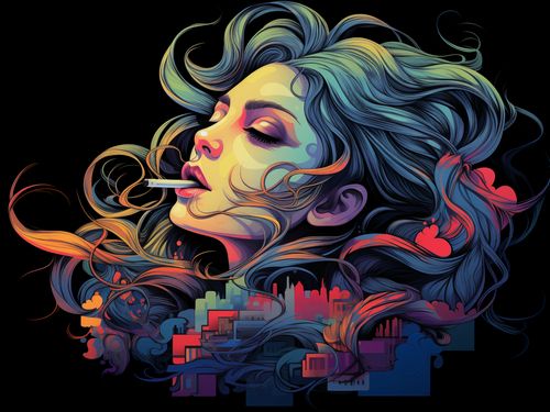 Plakat z serii pop art zatytułowany Sny o Samej Sobie. Ta intensywnie kolorowa ilustracja przedstawia profil młodej kobiety z zamkniętymi oczami, wdychającej życie miasta. Jej włosy i wydychany dym przenikają się, tworząc hipnotyzujące wzory, które płynnie przechodzą w sylwetki miejskiej panoramy. Paleta barw łączy głębokie granaty, żywe pomarańcze i delikatne pastele, co nadaje dziełu zarówno dynamikę, jak i eteryczną jakość. Plakat idealnie oddaje związek między osobistymi doświadczeniami a pulsującym życiem metropolii, co sprawia, że będzie on wyjątkowym dodatkiem do nowoczesnych, miejskich wnętrz, studiów artystycznych, czy loftów.