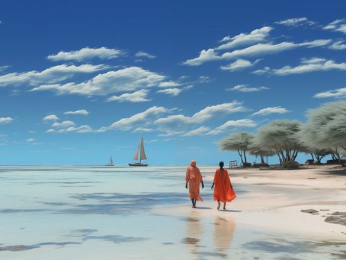 Plakat z serii pejzaże zatytułowany Spokój w Piaskach przedstawia dwie postacie w tradycyjnych pomarańczowych szatach, kroczących boso po dziewiczym piasku plaży. Ich spokojny postęp odzwierciedla harmonię i spokój, a delikatne fale i żaglowce w tle dodają uczucia swobody. Płynące chmury na niebie nadają scenie wrażenie przestrzeni i czasu, który wydaje się zatrzymany. Ten plakat emanuje duchowym spokojem i jest idealny do pomieszczeń przeznaczonych do medytacji, wypoczynku lub terapii, a także jako spokojny akcent w przestrzeniach hotelowych czy biurowych, gdzie zachęca do refleksji i wewnętrznej harmonii.