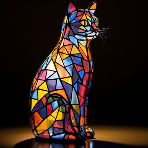 Plakat z serii abstrakcja zatytułowany Koci Witraż. Ten plakat przedstawia artystyczną ilustrację kota, który jest stylizowany na witraż. Zwierzę jest zbudowane z wielu kolorowych, geometrycznych kształtów, które przypominają szklane fragmenty witraża. Barwy są żywe i różnorodne, z przewagą odcieni niebieskiego, czerwonego, żółtego i pomarańczowego, tworząc wizualną ucztę, która zarówno przykuwa uwagę, jak i przyjemnie dla oka. Kot jest przedstawiony w profilu, siedząc z eleganckim, dostojnym położeniem, co dodaje ilustracji majestatycznego charakteru. Tło jest proste i ciemne, co pozwala na to, aby kolory kota były jeszcze bardziej wyraziste. Ta praca może być interpretowana jako hołd dla klasycznej formy sztuki, jaką jest witraż, połączony z nowoczesną grafiką cyfrową, tworząc unikalne i współczesne dzieło sztuki.