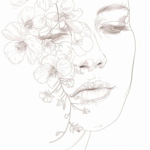 Plakat z serii wnętrza zatytułowany Kwitnąca Imersja przedstawia delikatny, linijny rysunek profilu kobiety, którego twarz częściowo zasłaniają i uzupełniają subtelne kwiaty. Delikatne linie twarzy kobiecej harmonizują z organicznymi kształtami roślin, sugerując jedność z naturą i subtelne piękno. Kwiaty wydają się być naturalnym przedłużeniem jej bytu, dodającym delikatności i eterycznego charakteru całej kompozycji. Ta minimalistyczna, ale wyrafinowana ilustracja emanuje spokojem i ukojeniem, idealna do przestrzeni medytacyjnych, salonów spa, lub jako elegancki element dekoracyjny w nowoczesnych wnętrzach.