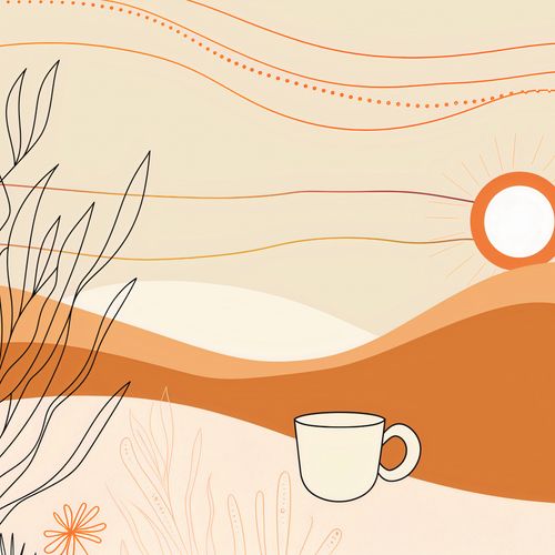 Plakat z serii minimalistyczne zatytułowany Ranna Pora. Plakat przedstawia stylizowany, spokojny krajobraz pustynny z wschodzącym słońcem, które emanuje ciepłem, barwiąc niebo w pastelowe odcienie. Ponad łagodnymi, falującymi wzgórzami widnieją delikatne linie, które mogą przypominać ciepłe prądy powietrza lub subtelne ozdoby. Na pierwszym planie znajduje się filiżanka kawy, umieszczona tak, jakby była częścią pustynnego terenu, co dodaje scenie element codziennego rytuału i spokoju. Plakat jest pełen ciepłych, ziemiście beżowych i pomarańczowych odcieni, które wprowadzają atmosferę relaksu i spokoju. Idealnie pasuje do przestrzeni wypoczynkowych, takich jak kawiarnie, salony, czy pokoje do odpoczynku, gdzie może pomóc stworzyć przytulne i spokojne otoczenie. Dzieło to z pewnością będzie przyciągać wzrok, będąc subtelny jednocześnie.
