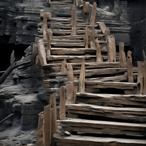 Plakat z serii pejzaże zatytułowany Schody do Nieznanego. Ten tajemniczy i intrygujący plakat przedstawia prymitywne, drewniane schody prowadzące w górę przez strukturę przypominającą starożytną ruiny lub naturalne formacje skalne. Zanurzone w półmroku, schody te wydają się zapraszać odkrywców do podjęcia podróży w nieznane, pełnej nieoczekiwanych odkryć. Plakat ten idealnie oddaje uczucie odkrycia i przygody, idealny dla przestrzeni zainspirowanych historią, naturą, czy literaturą eksploracyjną. Może stanowić inspirujący element w domach, biurach, a także w przestrzeniach publicznych takich jak kawiarnie tematyczne lub księgarnie.
