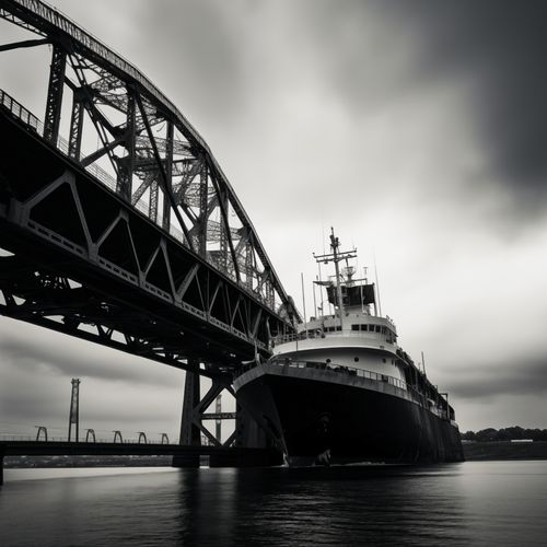 Plakat z serii pejzaże zatytułowany Statek przy Moście. Monochromatyczne przedstawienie statku pod imponującym mostem, gdzie struktury inżynieryjne łączą się z dynamicznym niebem, tworząc kompozycję symbolizującą siłę i postęp. Chłodna paleta barw i silne linie prowadzące oko przez obraz idealnie nadają się do nowoczesnych przestrzeni biurowych lub urbanistycznych salonów. Plakat ten przyciąga uwagę i inspiruje, odzwierciedlając majestat i piękno konstrukcji stworzonych przez człowieka.