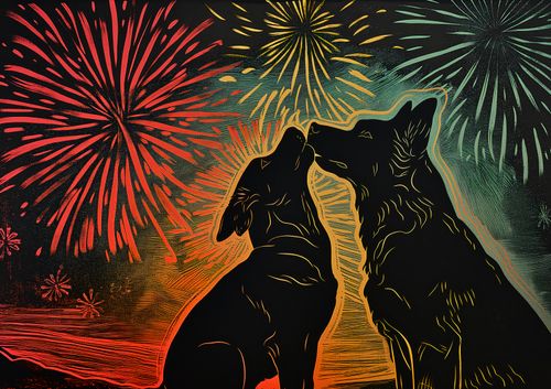 Plakat z serii abstrakcja zatytułowany Psi Uścisk. Przedstawia on dwie sylwetki psów, które wydają się być zwrócone ku sobie w gest podobny do uścisku, na tle intensywnie kolorowego nieba z fajerwerkami. Barwy od czerwieni po żółcie i zielenie tworzą tło, które wygląda jak nocne niebo w trakcie świętowania. Styl graficzny jest dynamiczny i pełen energii, a linie tworzące sylwetki psów są płynne i wyraziste. Ten plakat wyraża radość i nieodłączną więź pomiędzy zwierzętami, będąc doskonałym dodatkiem do wnętrz, gdzie chcemy podkreślić ciepło i pozytywne emocje.