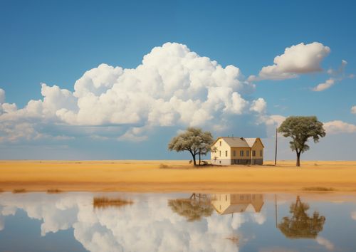 Plakat z serii pejzaże zatytułowany Domostwo, przedstawia idylliczny krajobraz z domem wiejskim, który odzwierciedla siatkę spokoju i prostoty. W centrum sceny znajduje się tradycyjny dom z jasnożółtymi ścianami i dachem w kolorze jasnoszarym, otoczony przez dwa okazałe drzewa oferujące cień i komfort. Płaski, rozległy krajobraz pokryty jest suchą, złotą trawą, która kontrastuje z błękitnym, rozległym niebem usianym puszystymi białymi chmurami. Poniżej, spokojna, błyszcząca tafla wody odbija dom i drzewa, tworząc doskonałe lustrzane odbicie, które dodaje głębi i symetrii kompozycji. Ten obraz przypomina o prostych przyjemnościach życia na wsi, gdzie czas wydaje się płynąć wolniej, a natura jest blisko. Idealnie wpasuje się w przestrzenie, które mają na celu wywołać poczucie spokoju i refleksji, takie jak domowe pokoje wypoczynkowe, gabinety psychoterapeutyczne lub pomieszczenia do medytacji.